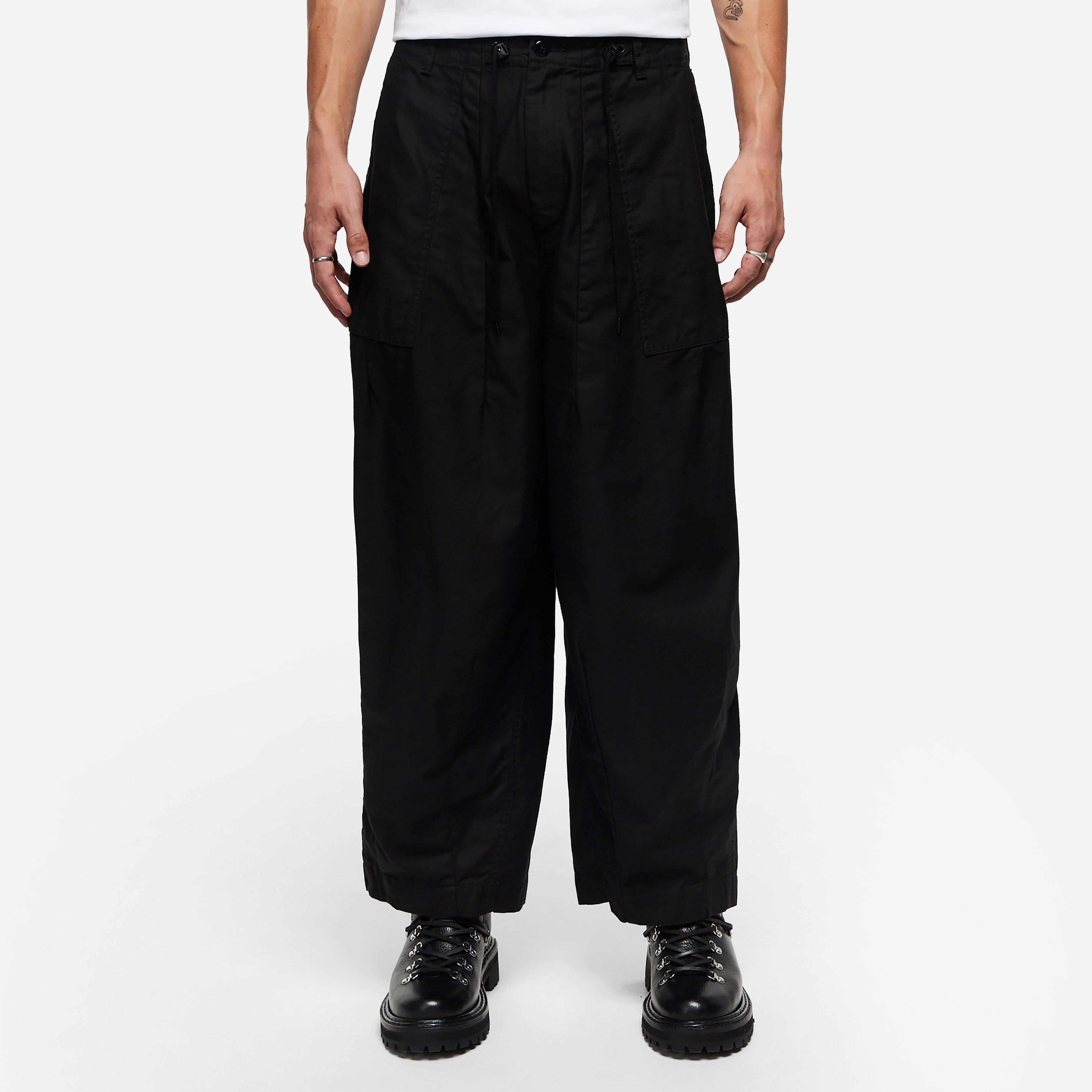 Cut wide through the leg with a cinched waist and hem, it forms the signature 'hiza-deru' silhouette. Heavy cotton twill and oversized patch pockets anchor the shape in function. Black - 100% cotton - Made in Japan - Loose shape - Model is 6'2.5" and wears a size medium