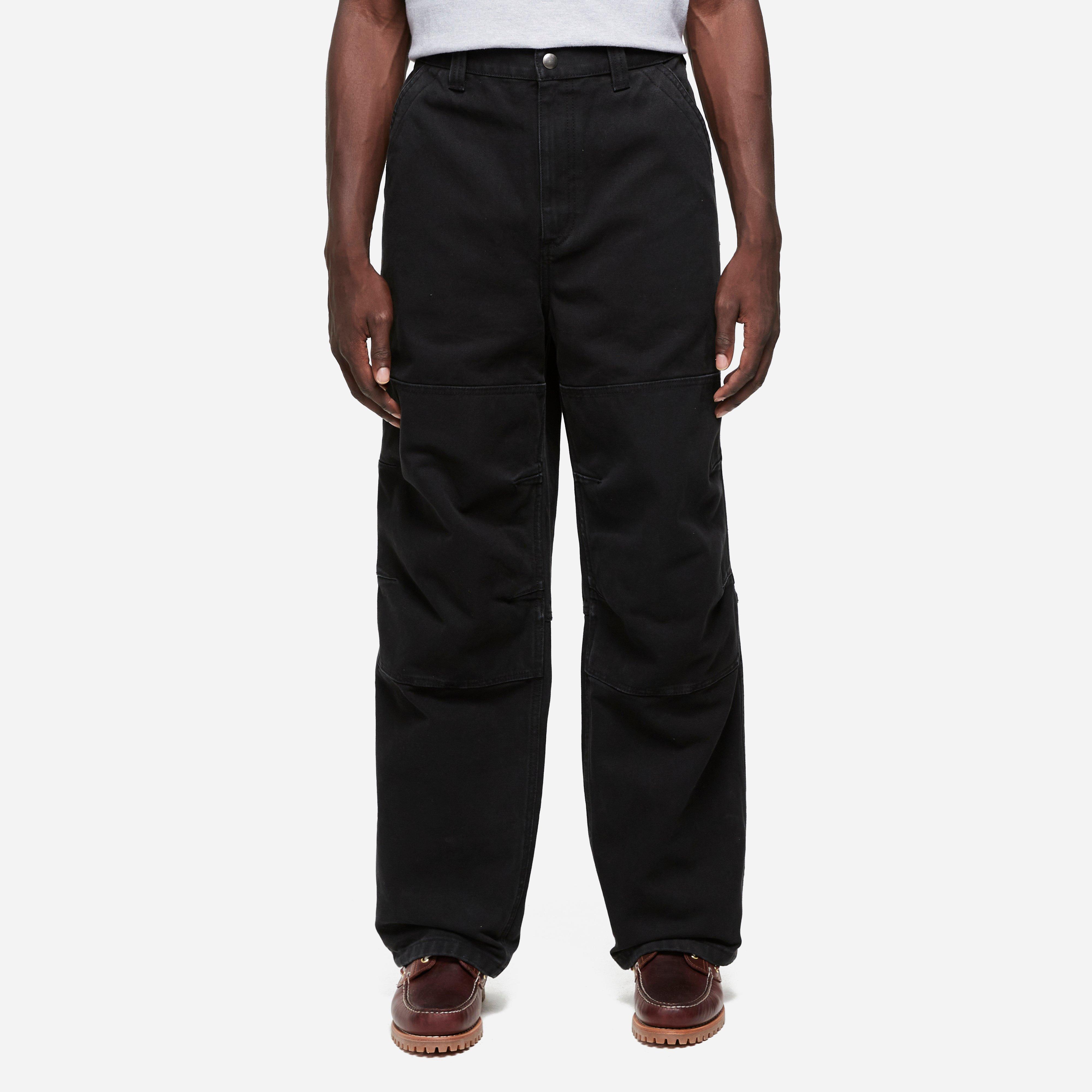 A. living. Black - 100% cotton - Relaxed fit - 5-pocket construction - Patch pockets - Reinforced knee panels - Tacked belt loops - Model is 6'2'' and wears a size 32''.