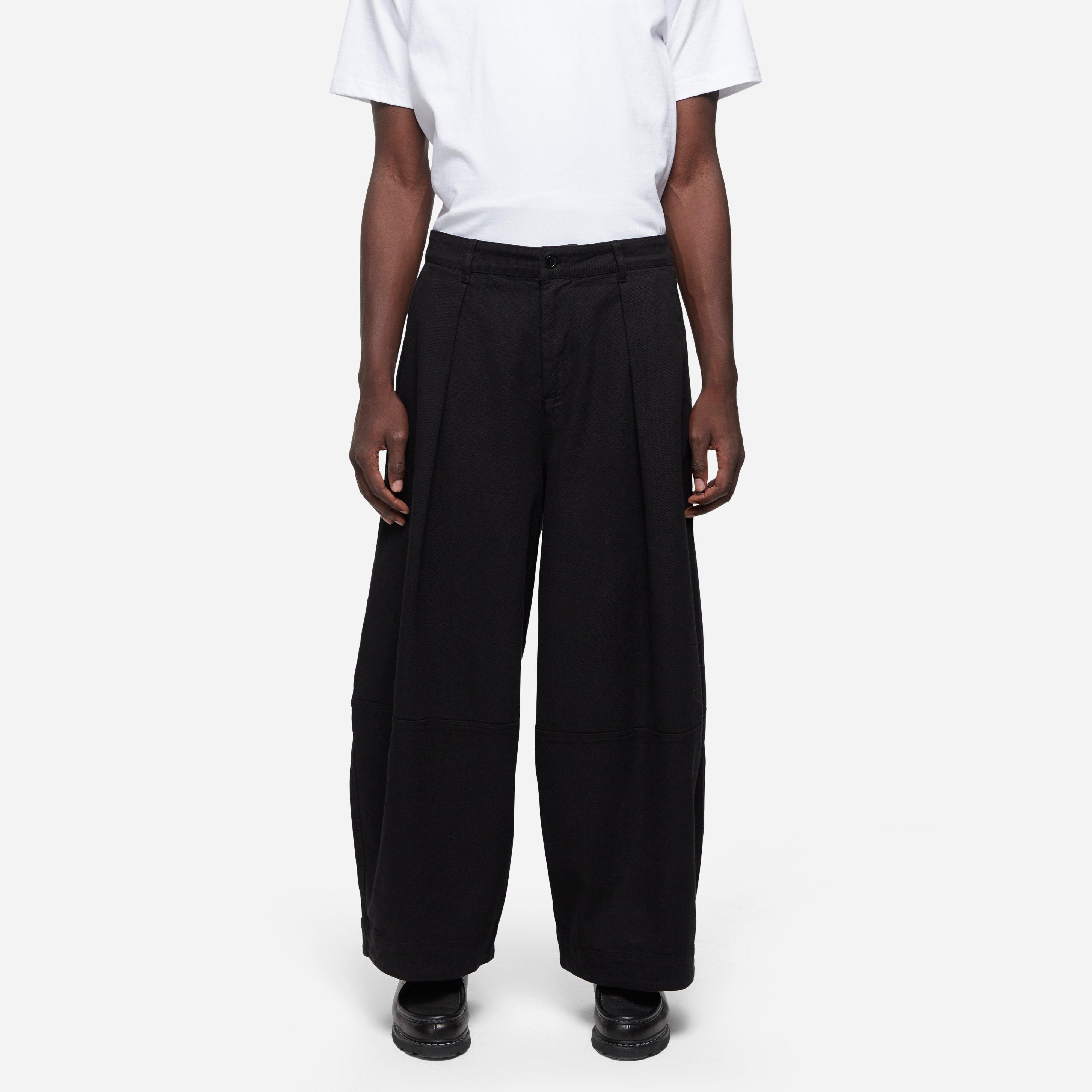 Black - 80% organic cotton, 20% linen - Relaxed fit - High waist - Wide leg - Garment dyed - Side pockets - Front pleats - Deep hem - Corozo button fastening - Model is 6'1" and wears a size medium.