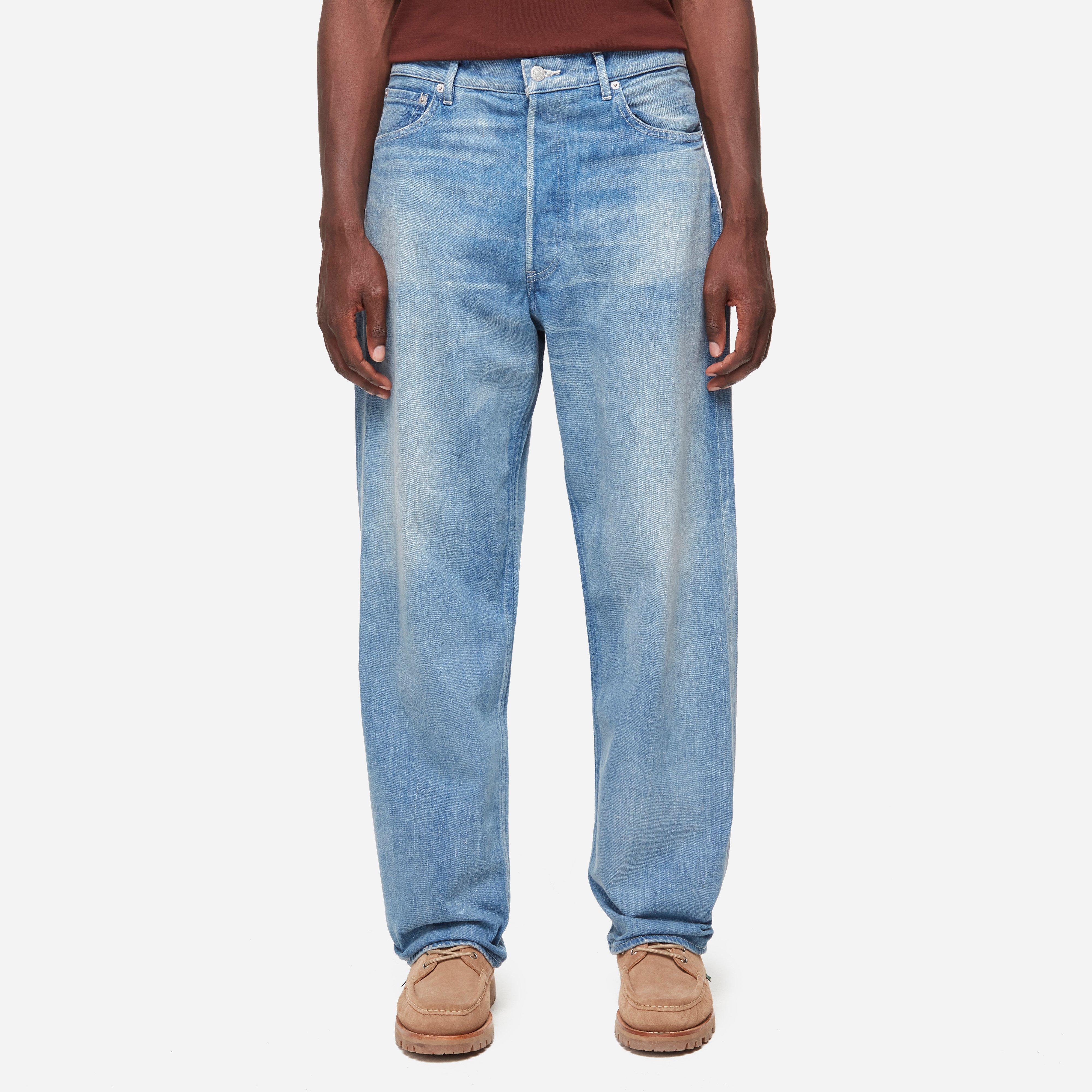The brand's Selvedge Jean is a tapered, wide leg piece derived from Supima cotton with a subtle faded wash and vintage texture that's achieved by skilled artisans. Blue - 100% cotton - Five pocket style - Belt loops - Button fly - Logo silver hardware - Made in Japan - Model is 6'1" and wears a size a size 5 - Waist size guide: 3=33", 4=33.7", 5=36.2"