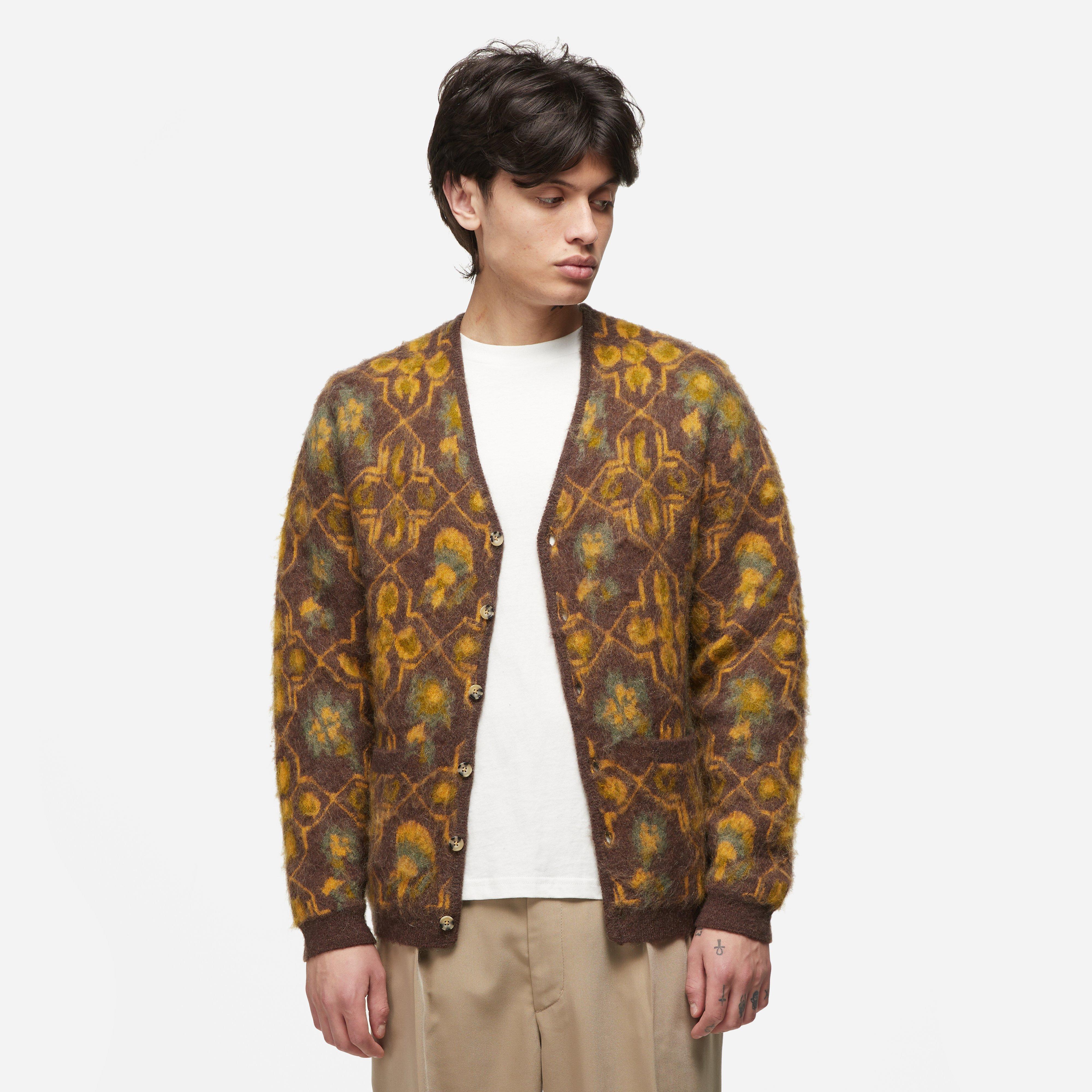 Brown - 42% nylon, 32% wool, 26% mohair - Button closure - Jacquard pattern - Ribbed trims - Lower pockets - Regular fit, take your normal size - Model is 6'1" and wears a size medium.