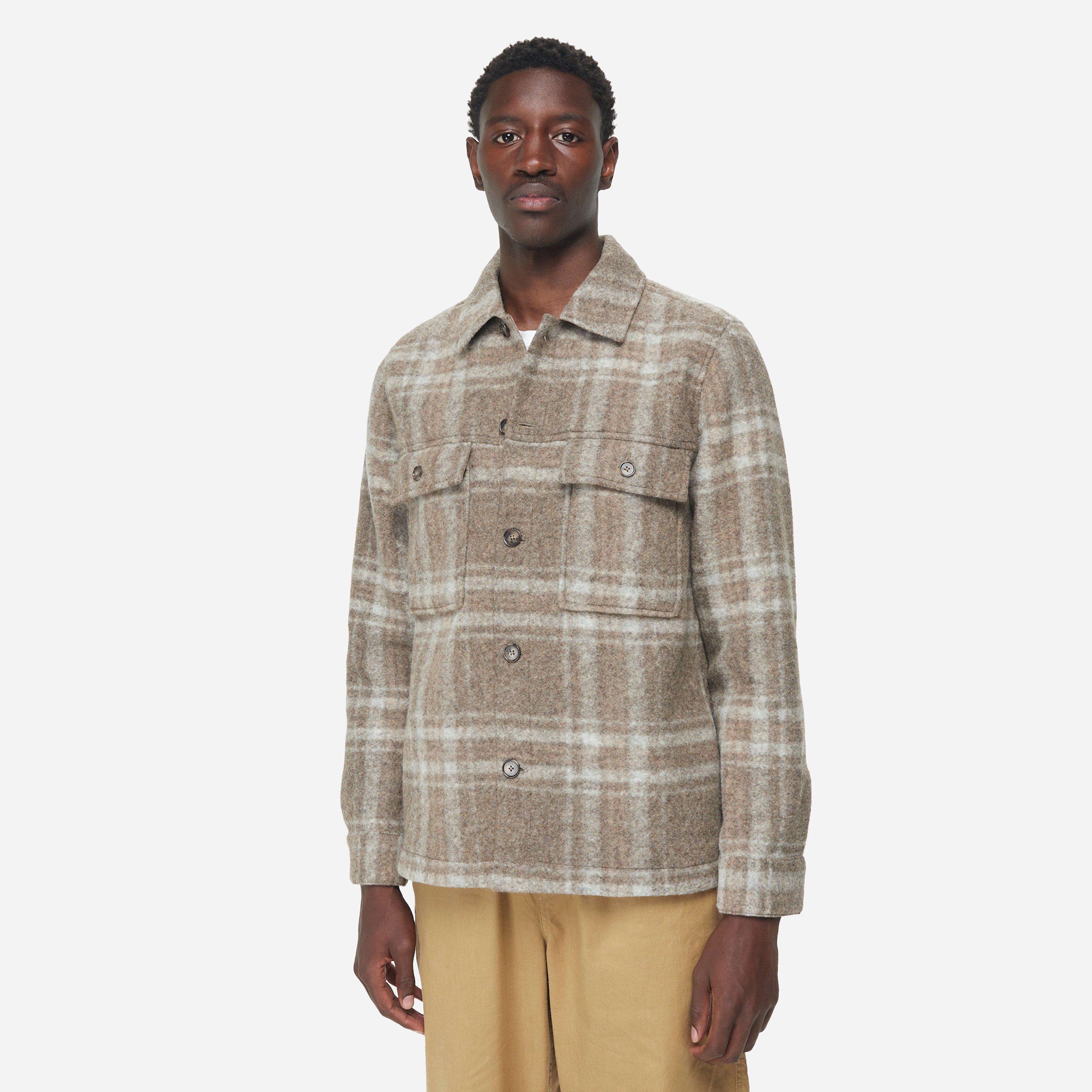 Copenhagen brand NN07 have sourced a fine wool-blend from Italy, rendered in a subtle check pattern. Brown - 74% wool, 36% polyester - Flap chest pockets - Engraved logo buttons - Front yoke - Regular fit, take your normal size - Model is 6'1" and wears a size medium.