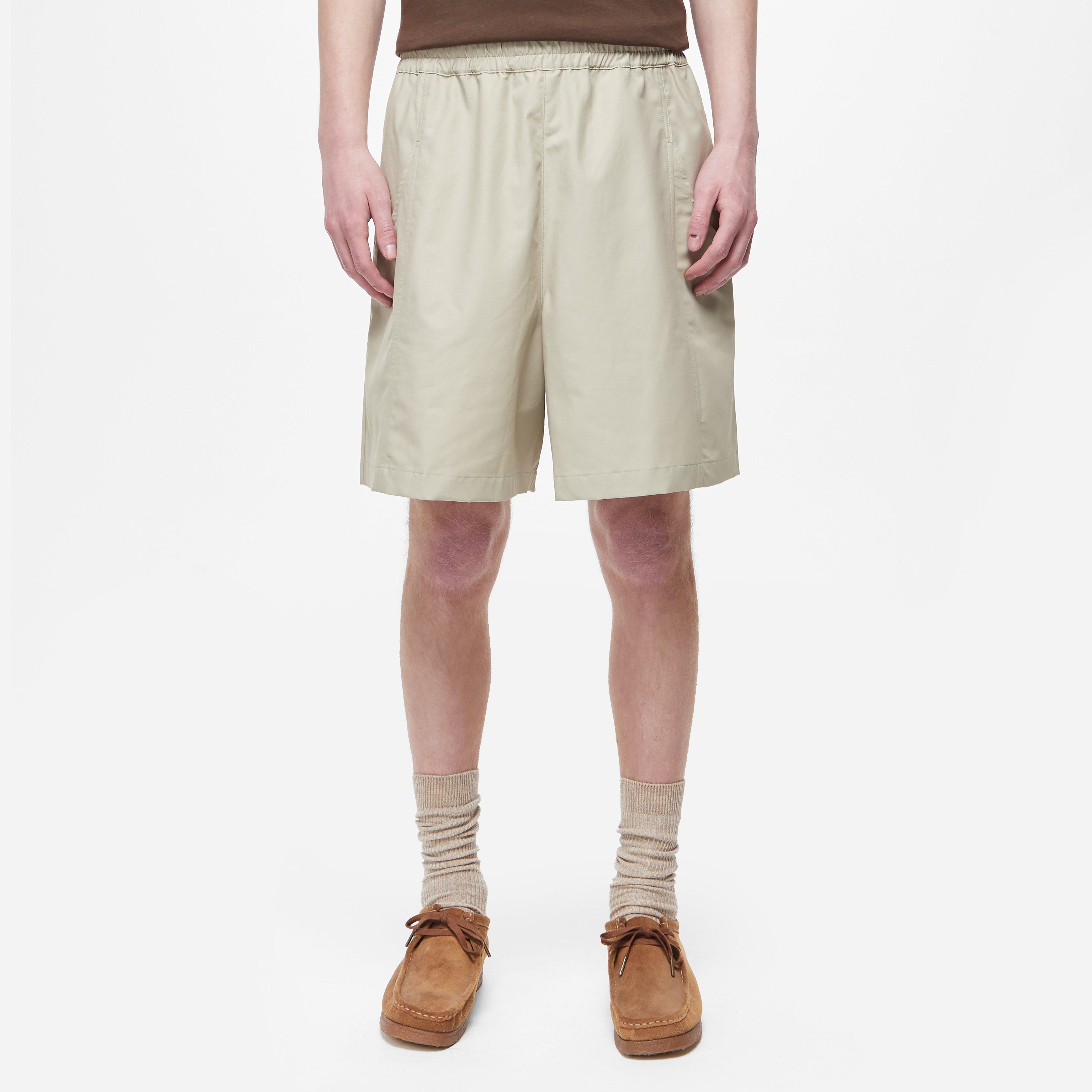 Beige - 58% cotton, 42% polyamide - Elastic waist - Back and side pocket - Model is 6'1" and wears size medium