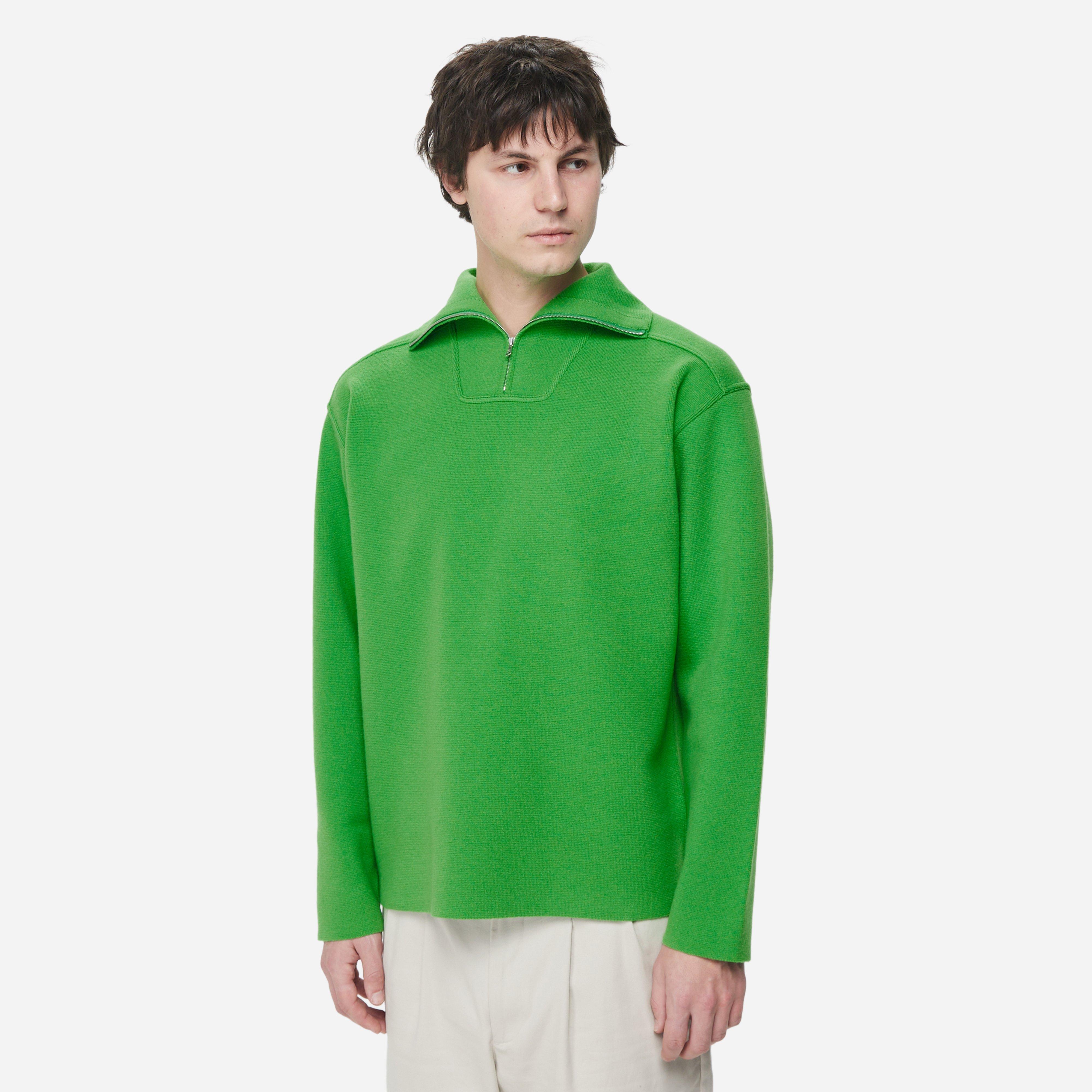 The Zip Turtleneck is a sophisticated contemporary shape crafted in a milano rib made of fine spun yarn blended from several considered wools, producing an exquisite peacheskin-like texture. Green - 100% - 93% wool, 6% nylon, 1% polyurethane - Ribbed zip collar - Made in Japan - Boxy fit, take your normal size - Model is 6'1" and wears a size medium.