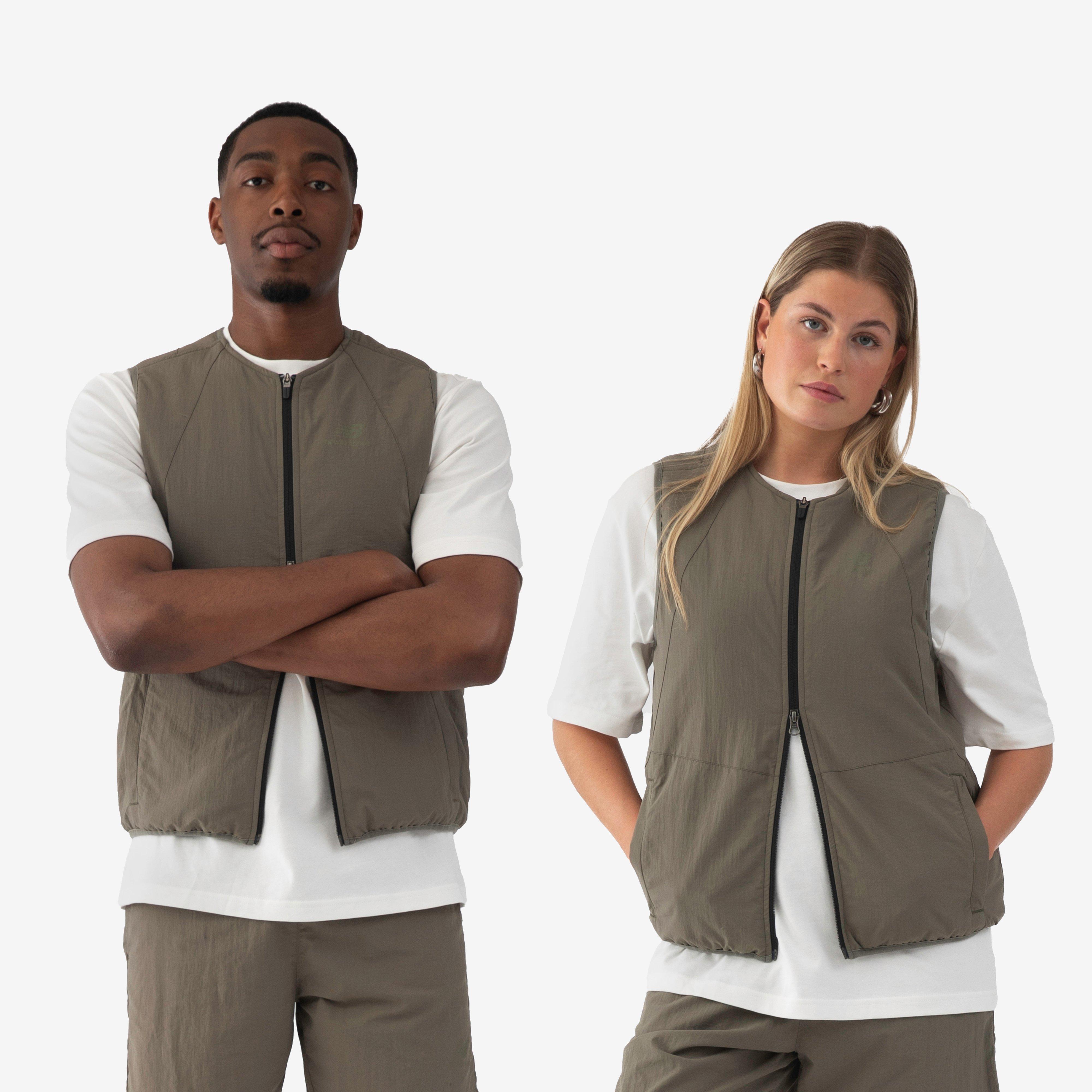 Green - 100% nylon - 2-way zip up - Light padding - Lower pockets - Rear zipped pocket - Elastic trims - Regular fit, take your normal size - Derrick is 6'3" and wears a size large and Jess is 5'7" and wears a size medium.