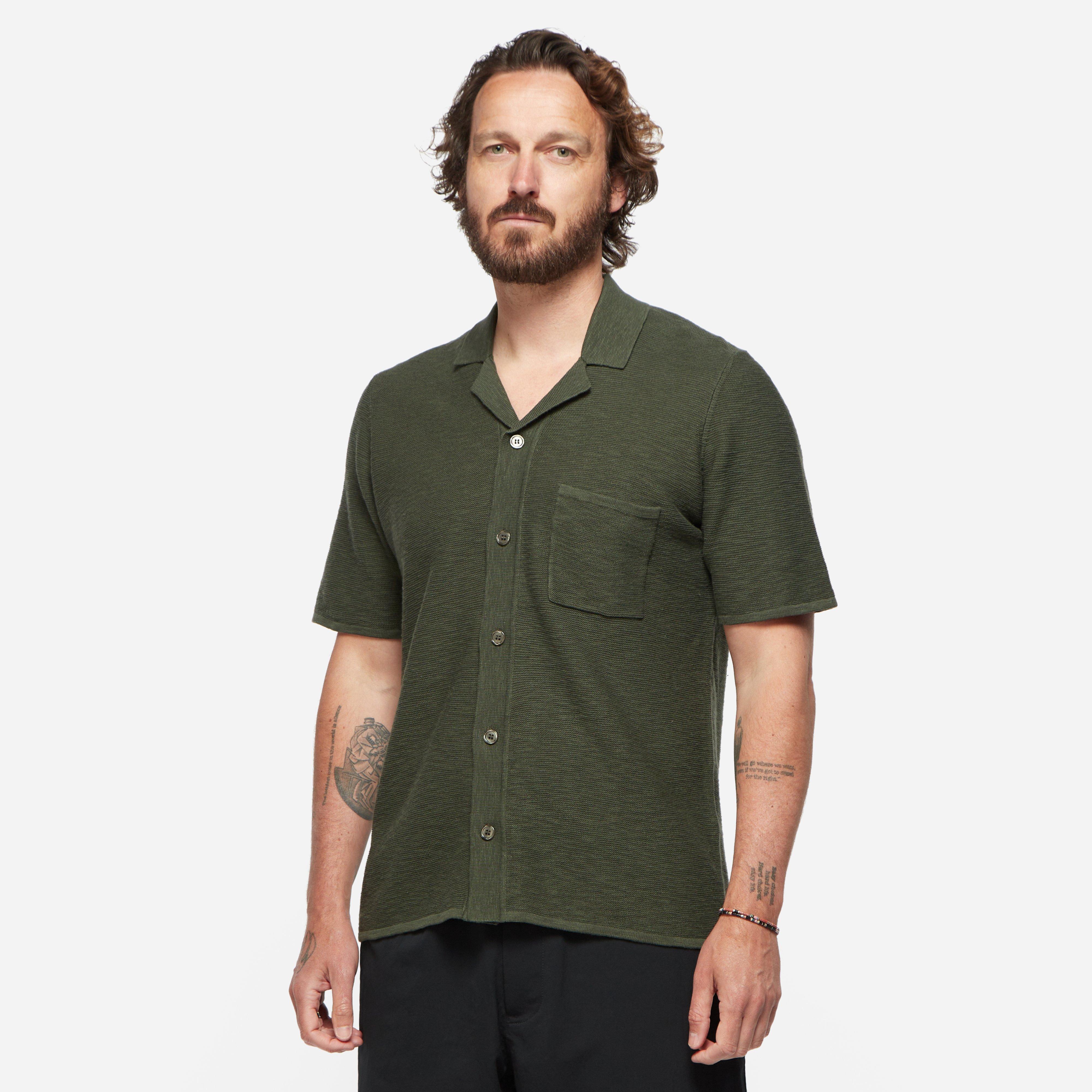 Green - 100% organic cotton/ linen - Button up - Open collar - Regular fit, take your normal size - Model is 6'1" and wears a size medium.