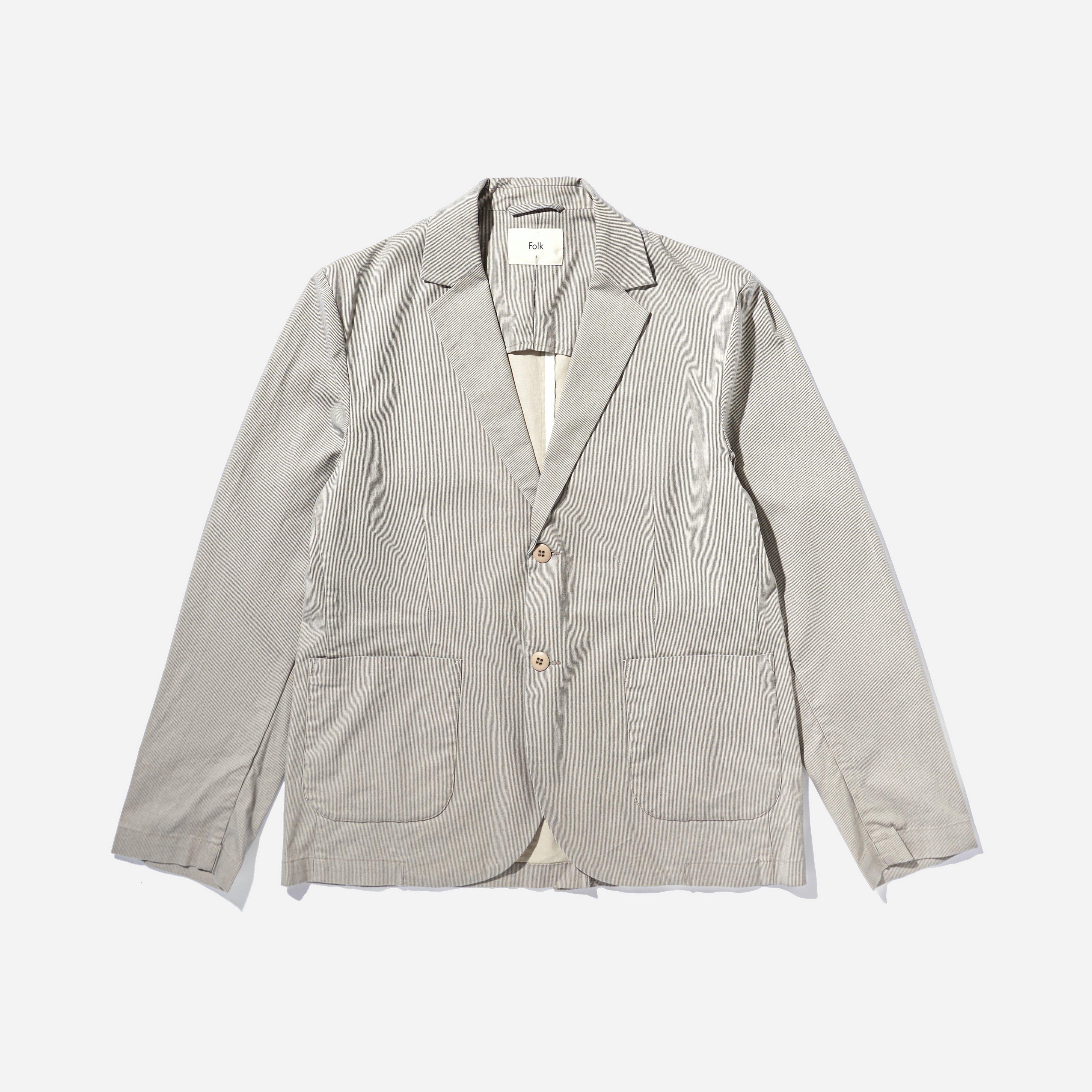 It is cut from a linen cotton blend that is summery and light, with a soft yet dry handle. The fabric has been garment dyed to add further intensity to its colour and enhanced with a subtle stripe pattern. Grey - 55% linen, 45% cotton - Regular fit, take your normal size - Model is 6'1" and wears a 3 - Size guide: 1=XS, 2=S, 3=M, 4=L, 5=XL - Notch lapels - Patch pockets - Side vent - Three button cuffs.