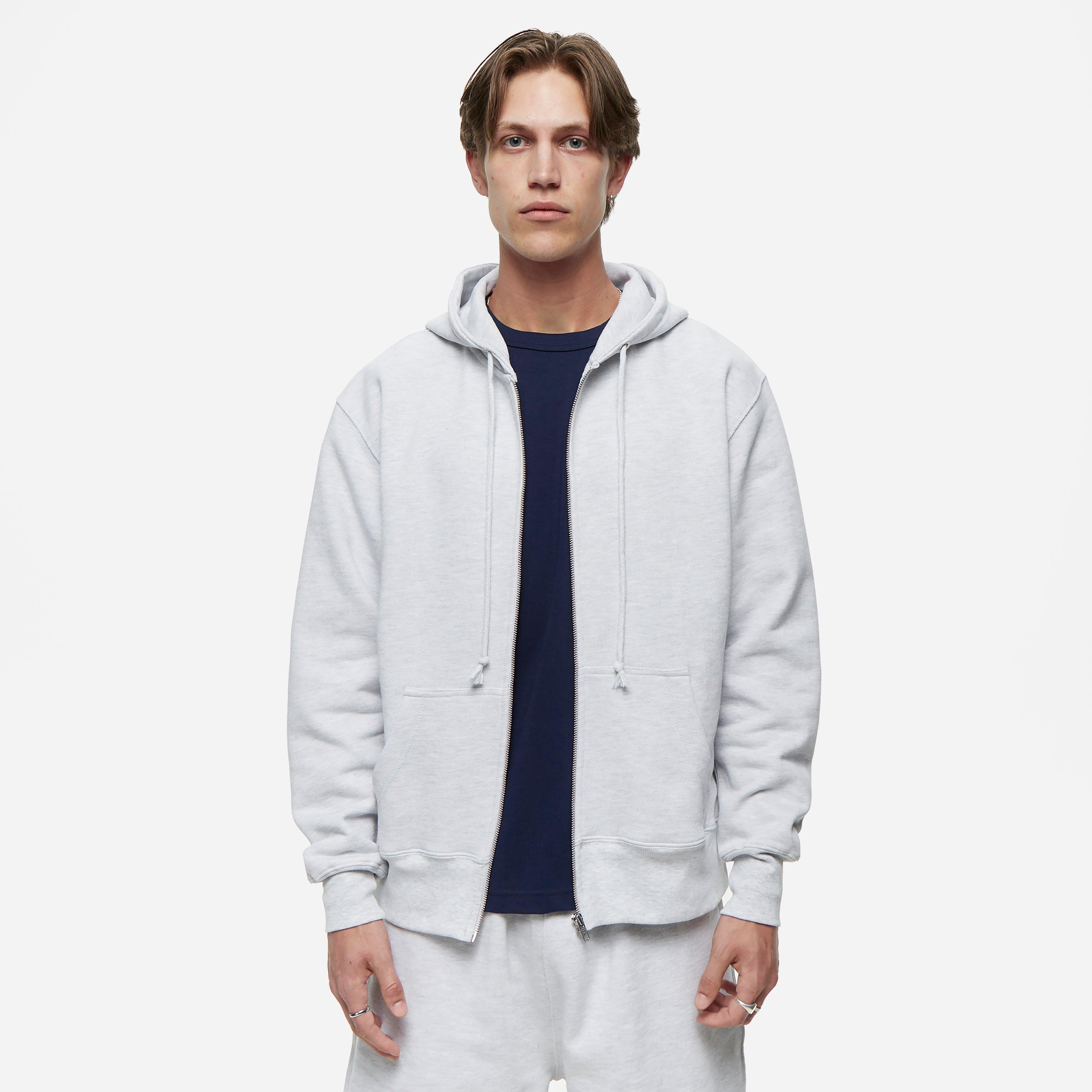 Grey - 14oz GOTS organic cotton - 450gsm - Front zip - Drawstring hood - Ribbed cuffs & hem - Model is 6'2.5" and wears a size medium