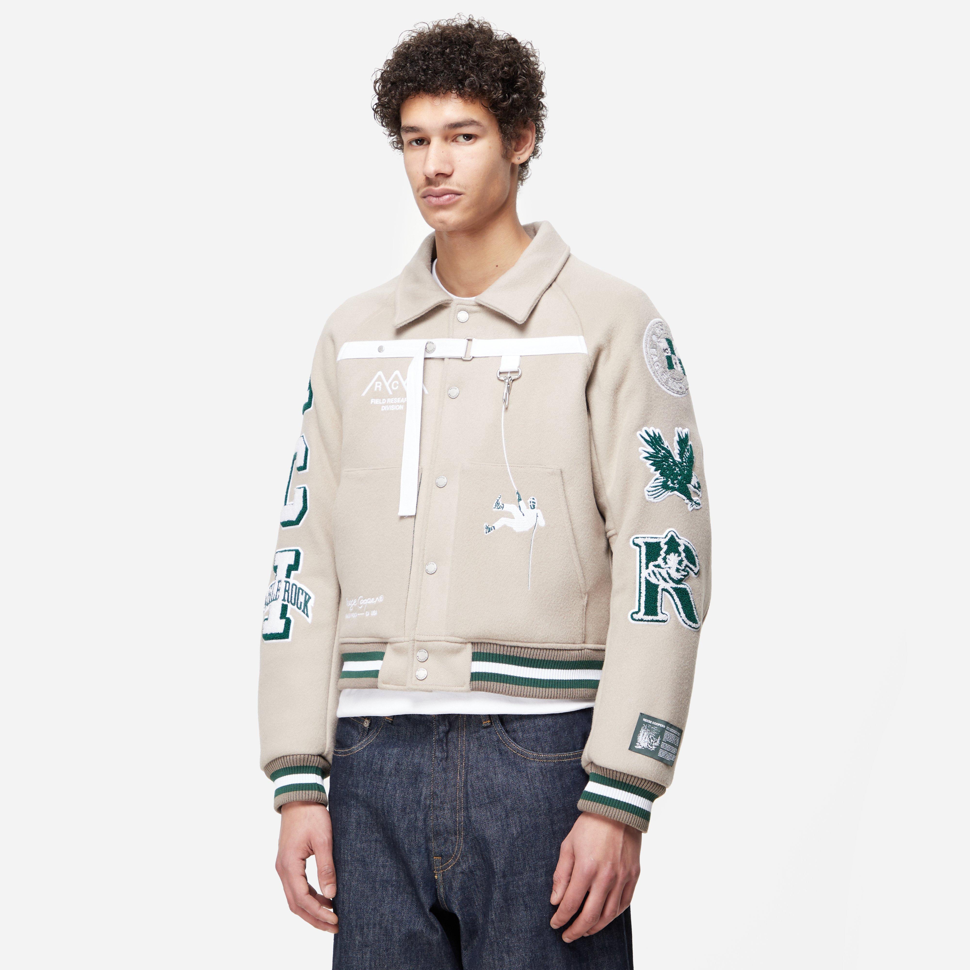 Storytelling with embroideries and chenille patches, the Jacket is meticulously constructed in 'Stone' coloured wool for a luxurious interpretation. Grey - 100% wool - Padding: Primaloft - Ribbed trims - Embroidered branding - Snap button closure - Hook detail - Lower pockets - Cropped fit - Model is 6'3" and wears a size medium.