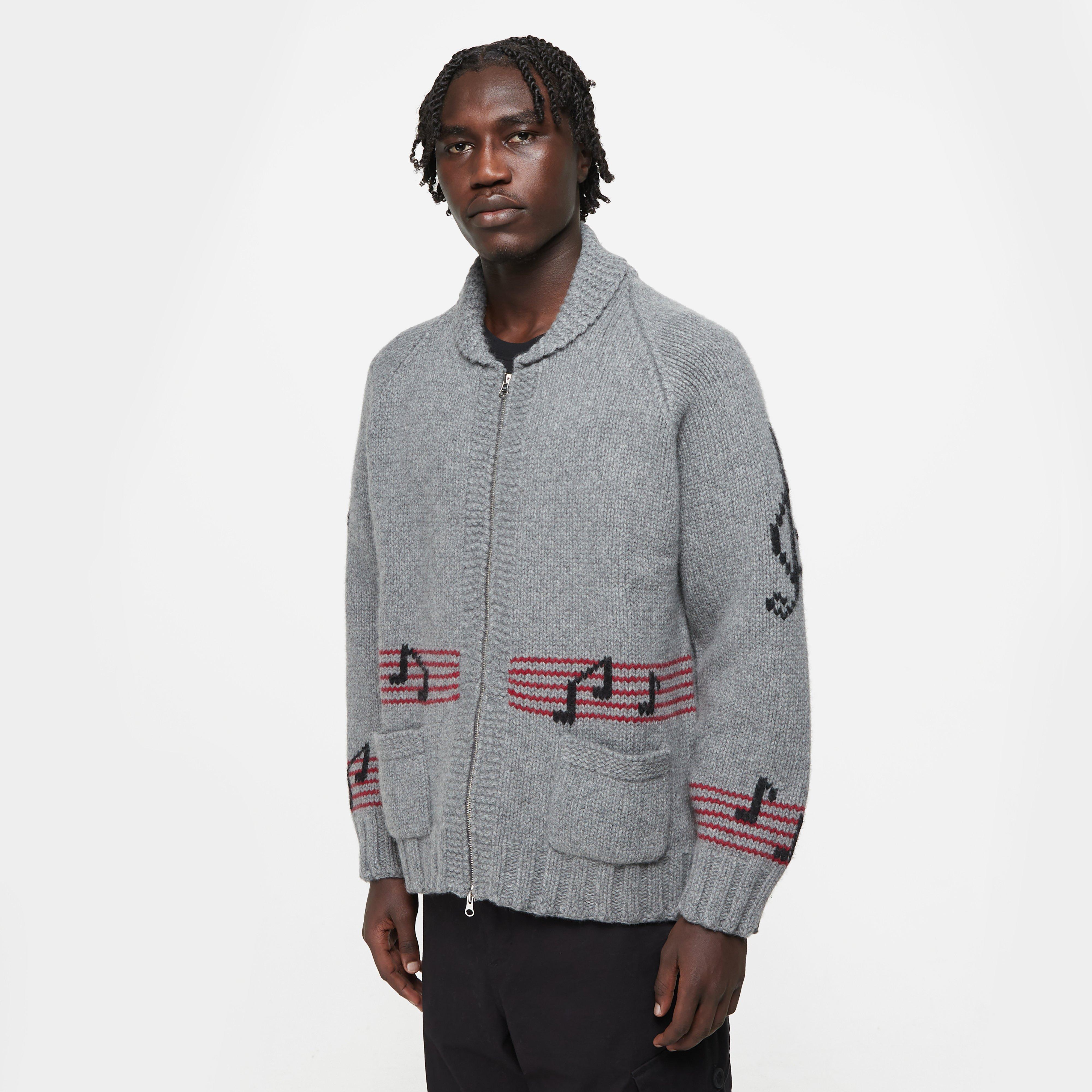 Grey – 80% wool/20% nylon – Oversized fit – Handknit blend – Shawl collar – Pocket welts – Dancer intarsia – Ribbed neck, cuff and hem – Model is 6’2’’ and wears a size medium.