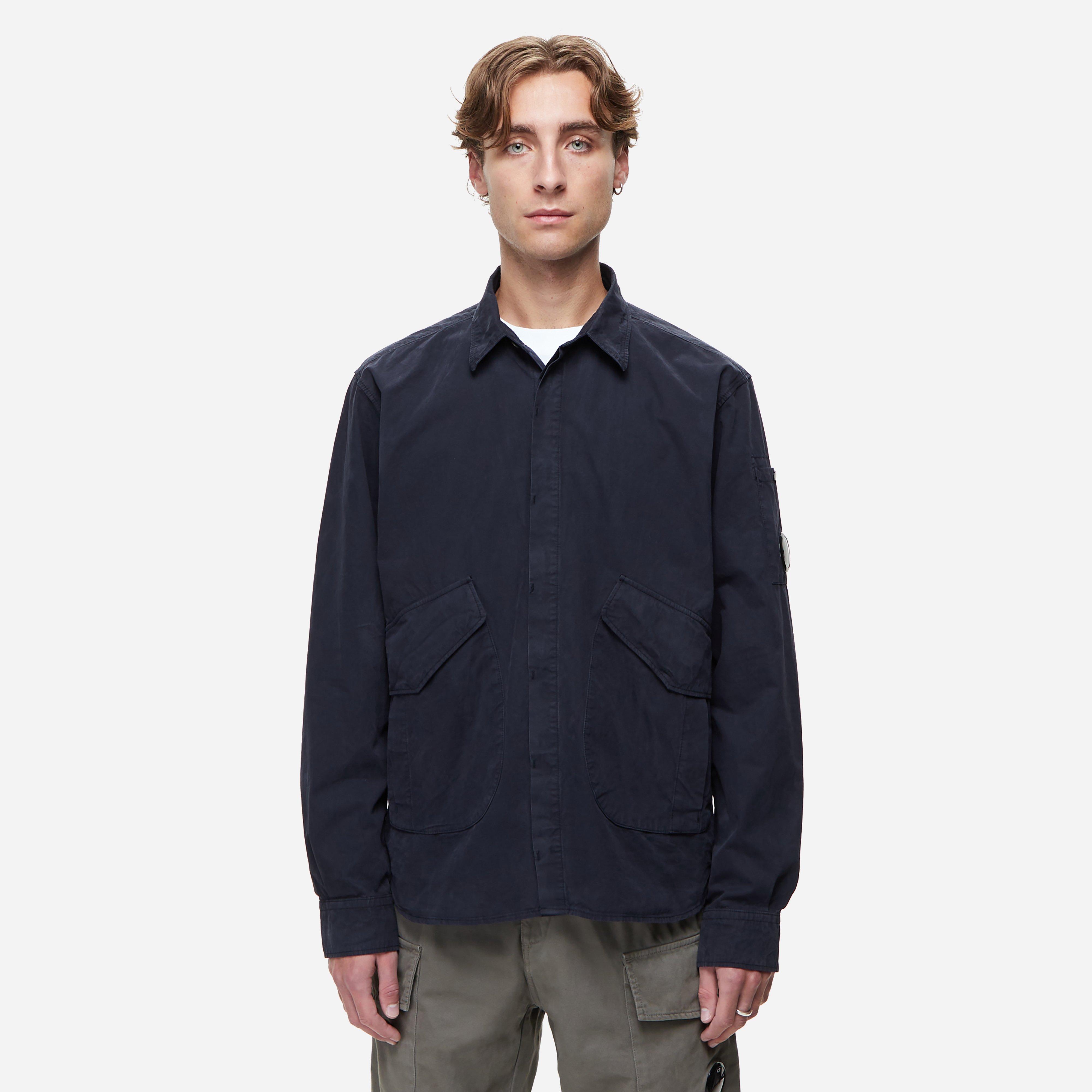 P. Company create non-conformist interpretations of functional menswear classics with artisanal expertise. Navy - 100% cotton - Hidden button closure - Lens detail - Front flap pockets - Adjustable button cuffs - Garment dyed - Regular fit - Model is 5'11" and wears size medium.