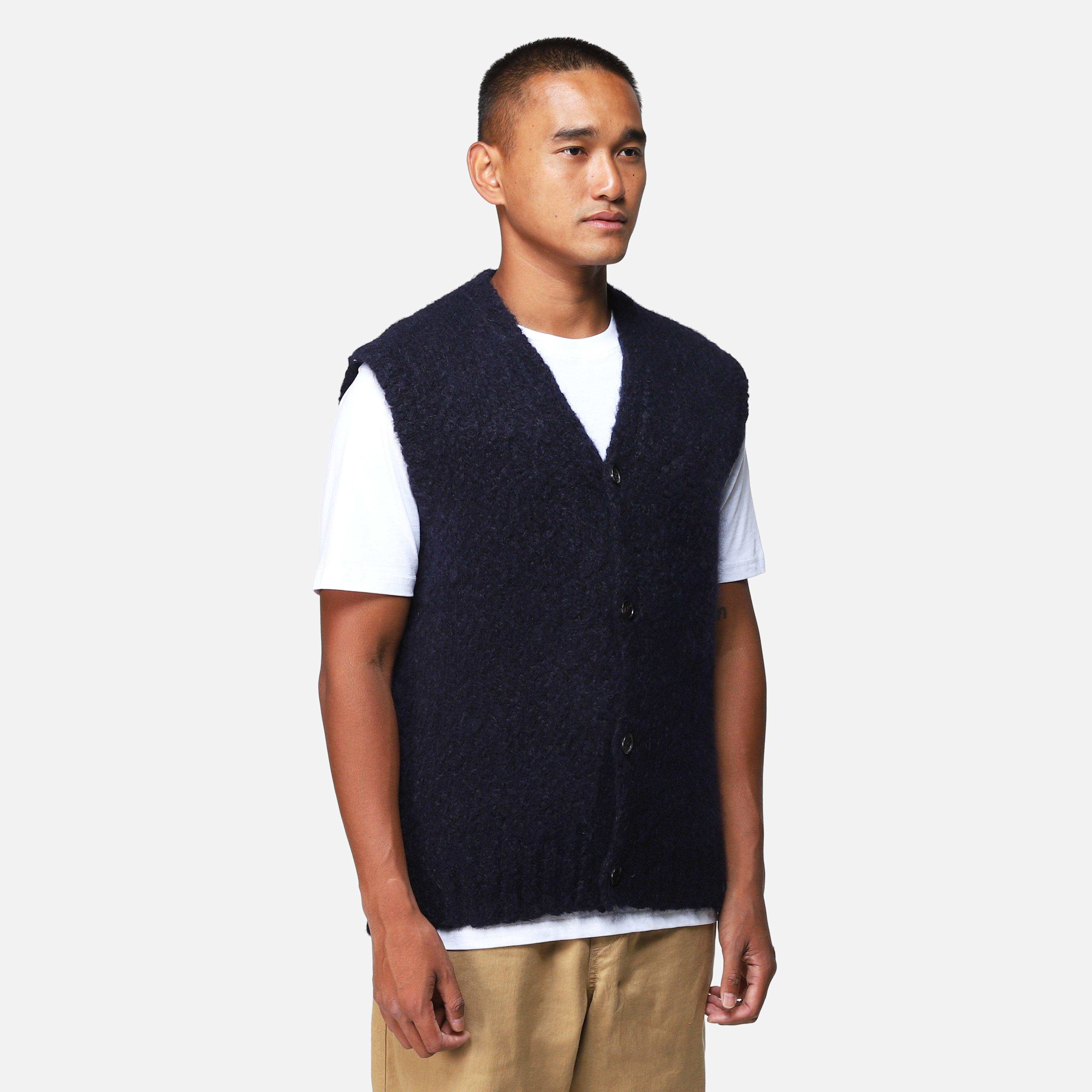The piece has a soft fluffy texture and is insulated, making it suited for layering and standalone wear. Black - 87% fine alpaca, 13% polyamide - 3 gauge knit - Button closure - Knitted in Italy - Regular fit, take your normal size - Model is 6'1" and wears a size medium.