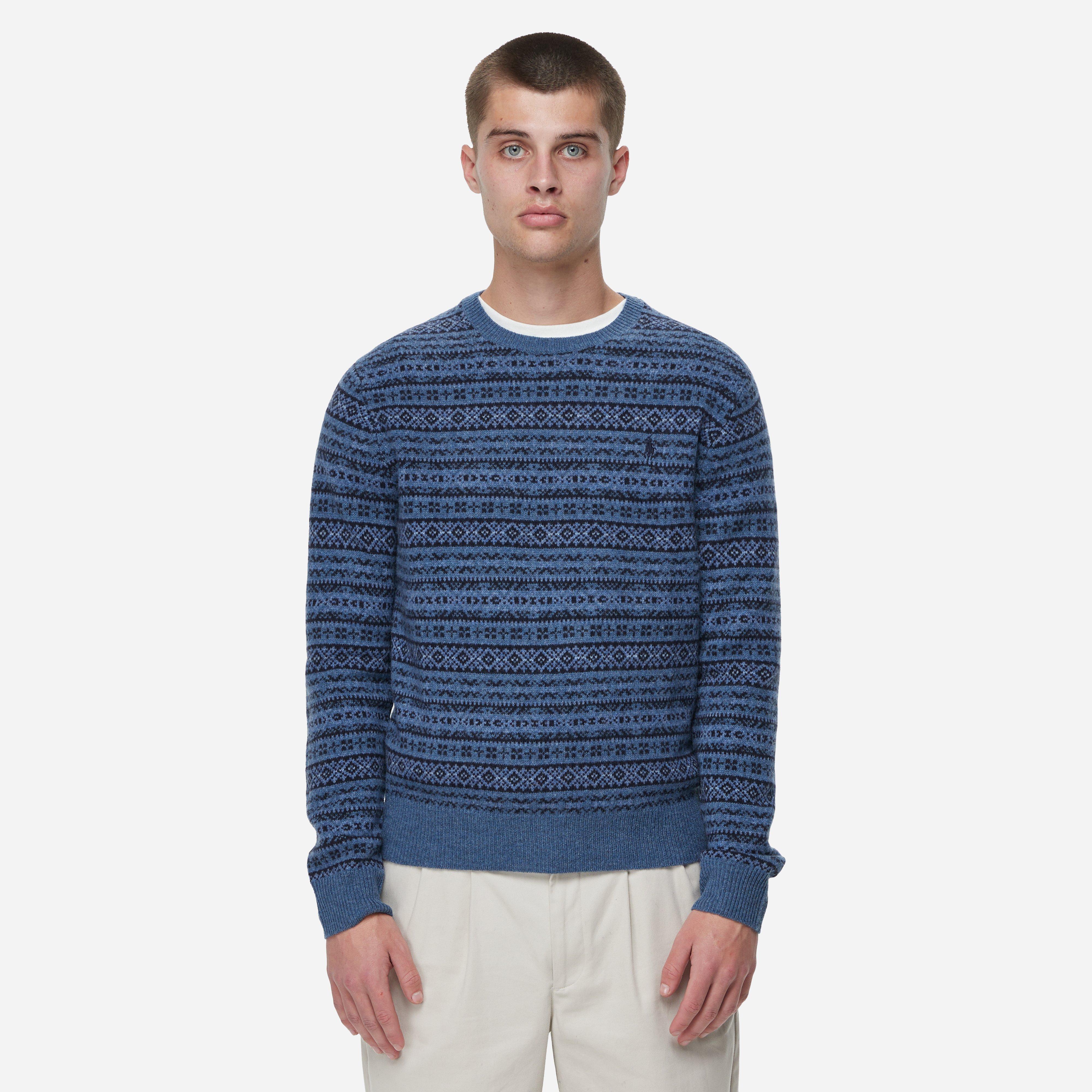This Sweat is filled with character - utilising a jacquard-knit technique with four wool yarns create a timeless Fair Isle motif. Navy - 100% wool - Ribbed trims - Regular fit, take your normal size.