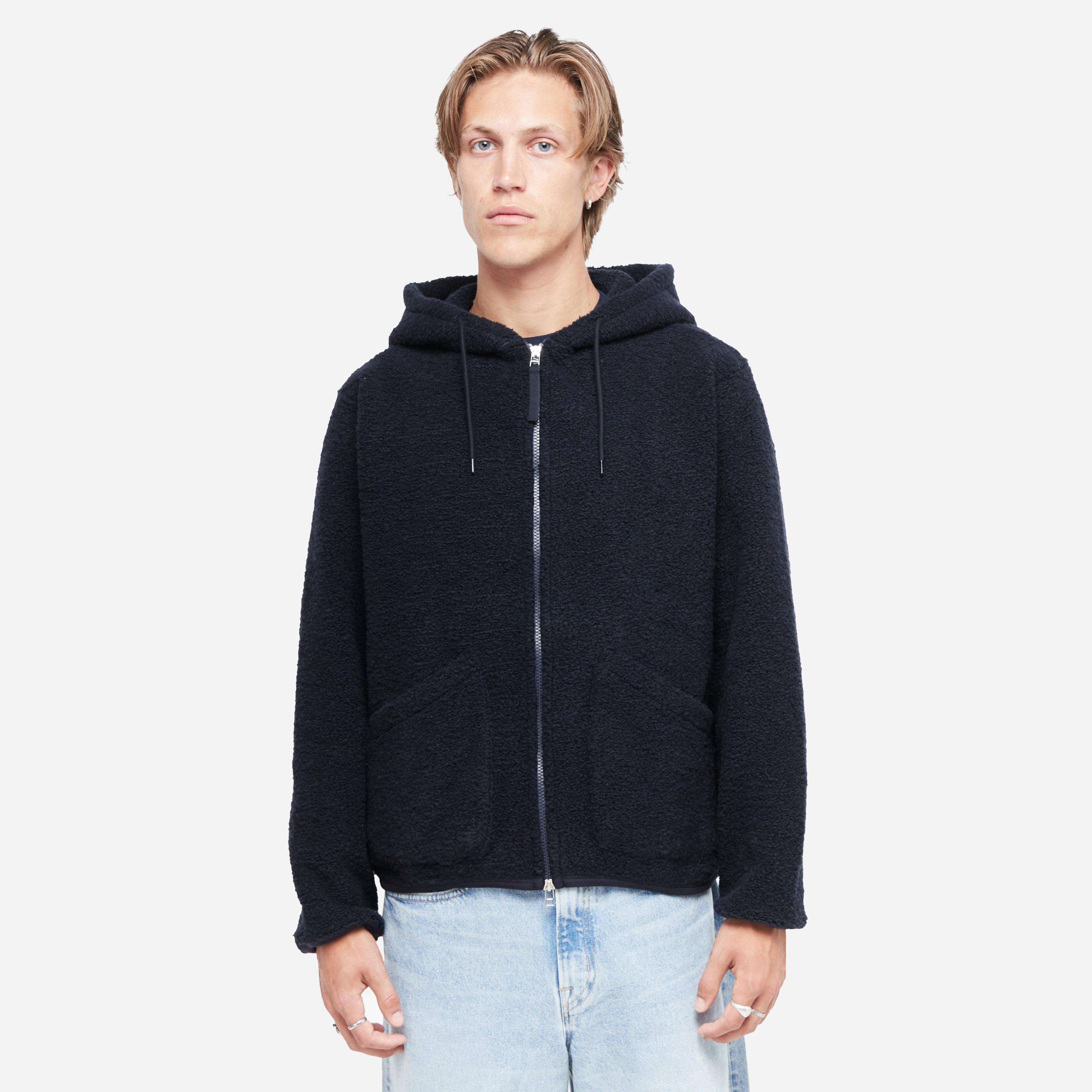 Navy - 70% recycled polyester, 30% recycled wool - Regular fit - Bonded cuffs & hem - Largo hood - 2 way zip - Patch pockets - Model is 6'2.5" and wears a size medium.