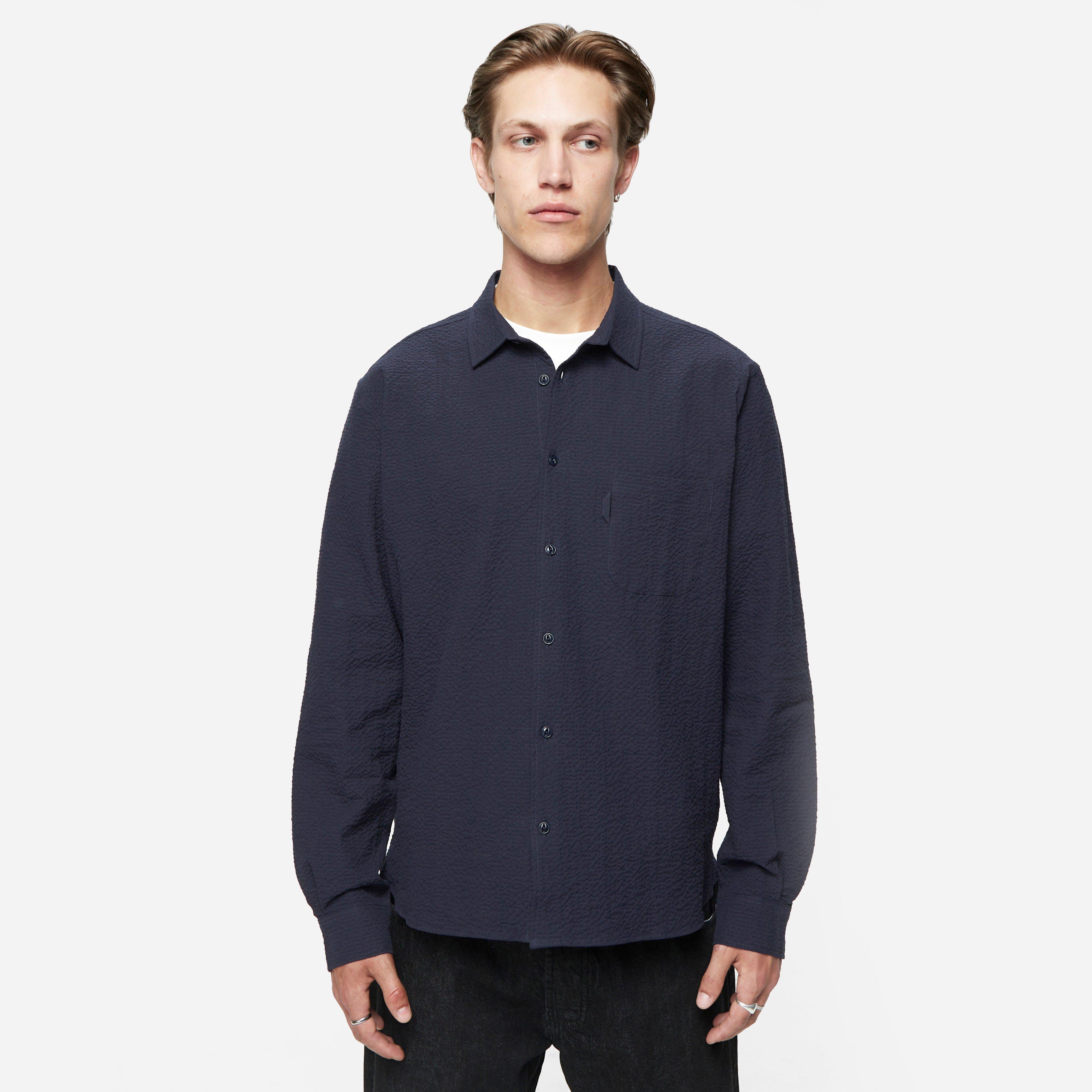 Navy – 98% organic cotton, 2% elastane – Relaxed fit – Seersucker fabric – Self fabric chest pocket – Corozo buttons – Made in Portugal – Model is 6’2.5’’ and wears a size medium.