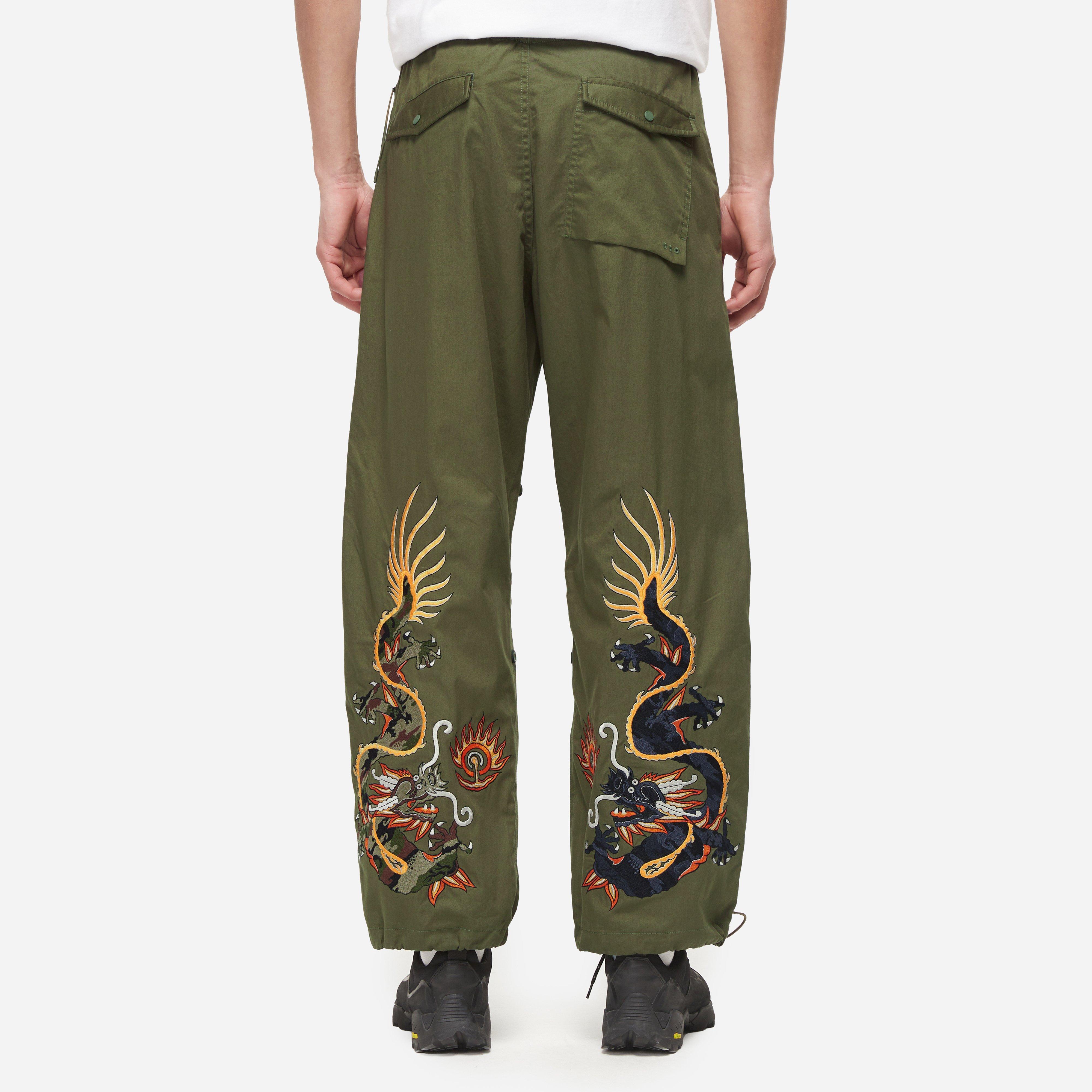 Olive - 50% hemp/50% organic cotton – Adjustable waist and hem – Secure zip pocket – Preformed leg shape - Original Dragon embroidery – Model is 6’4’’ and wears a size medium.