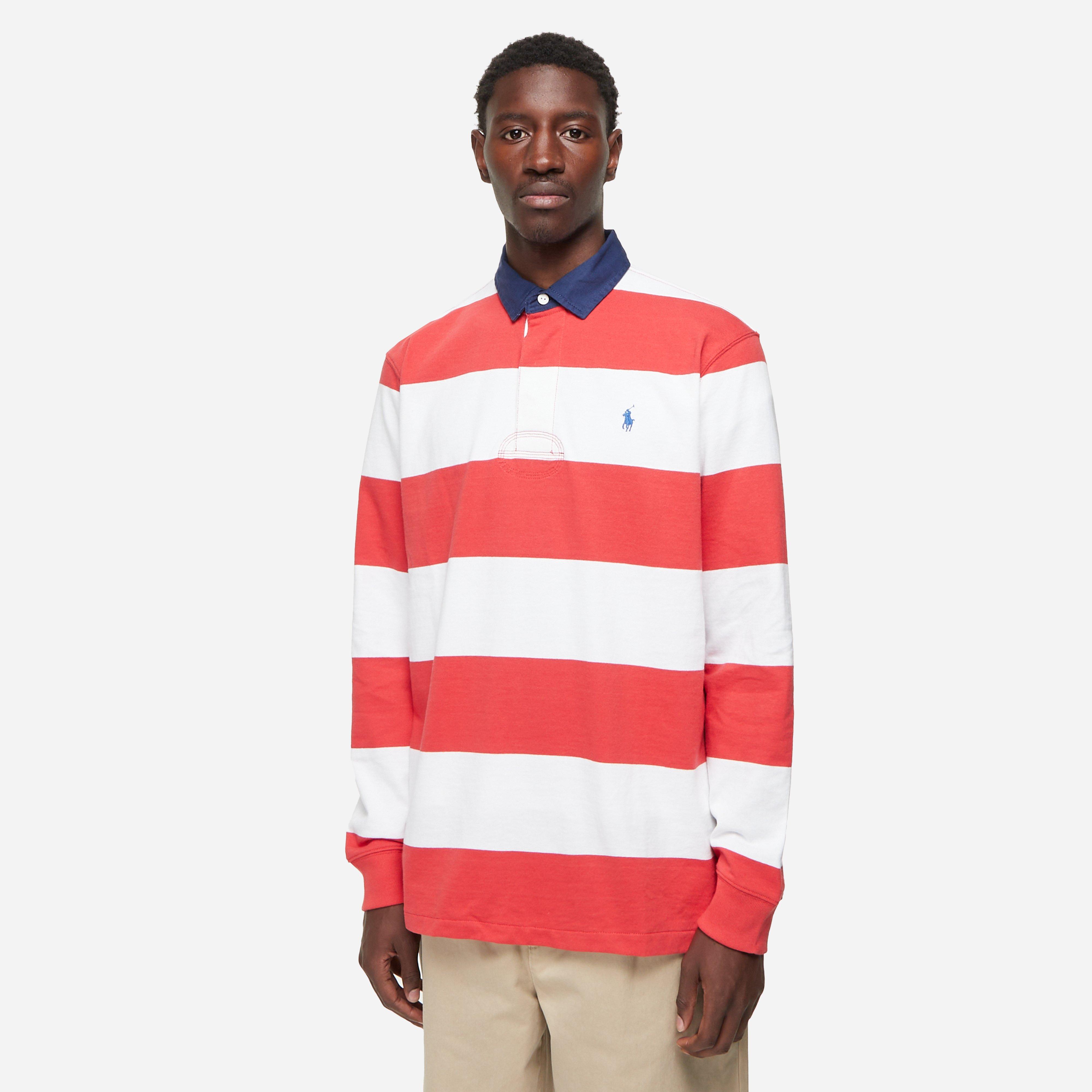 Polo Ralph Lauren's Striped Rugby Shirt is a nostalgic heritage piece within its rich preppy archives, twisted this season with a subtle touch of colour contrast at the collar.