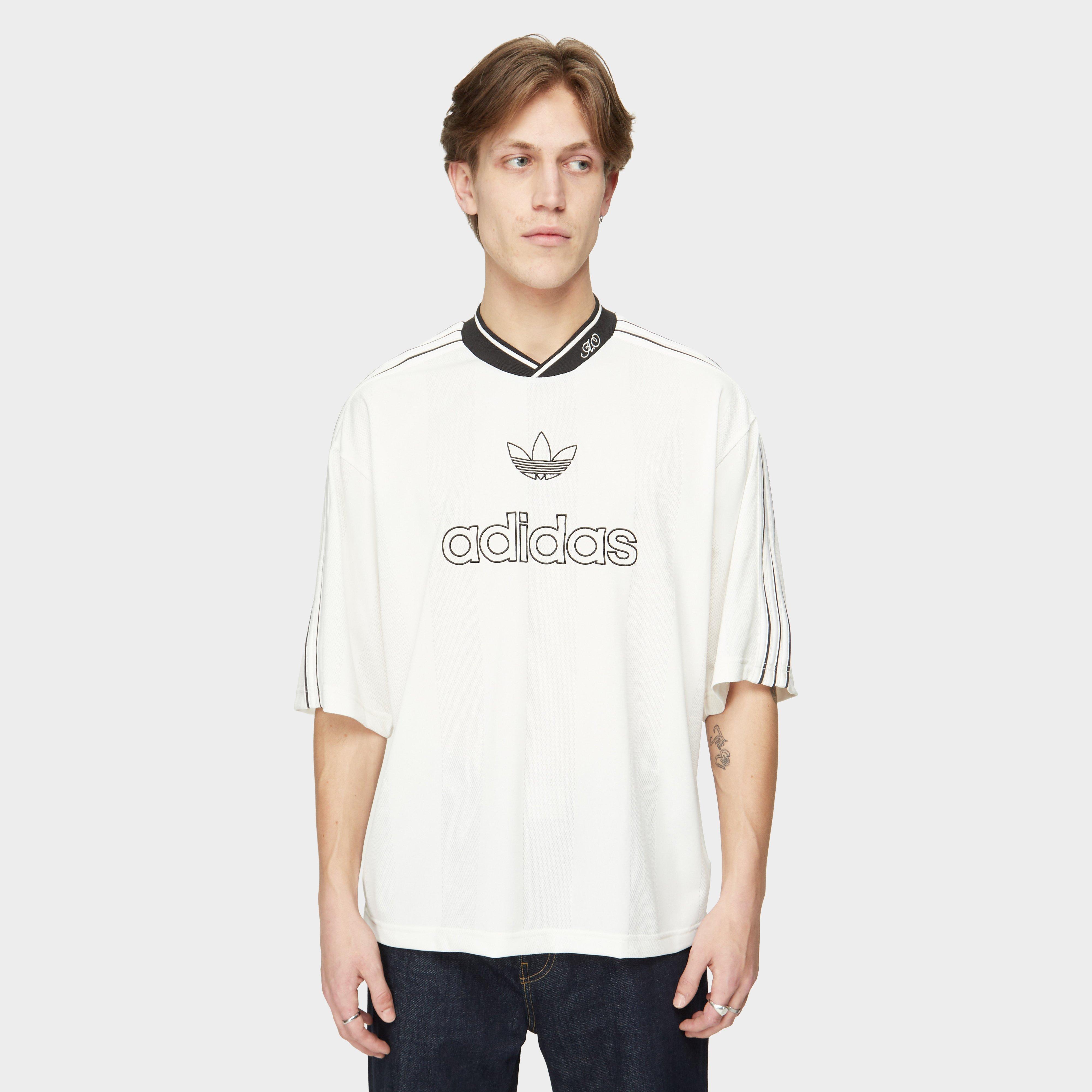 The Knit Jersey takes design notes from the label's Santiago cutline with archive-inspired graphics from 1994. White - 100% recycled polyester - Oversized fit - Three stripes - Model is 6'2.5" and wears a size medium