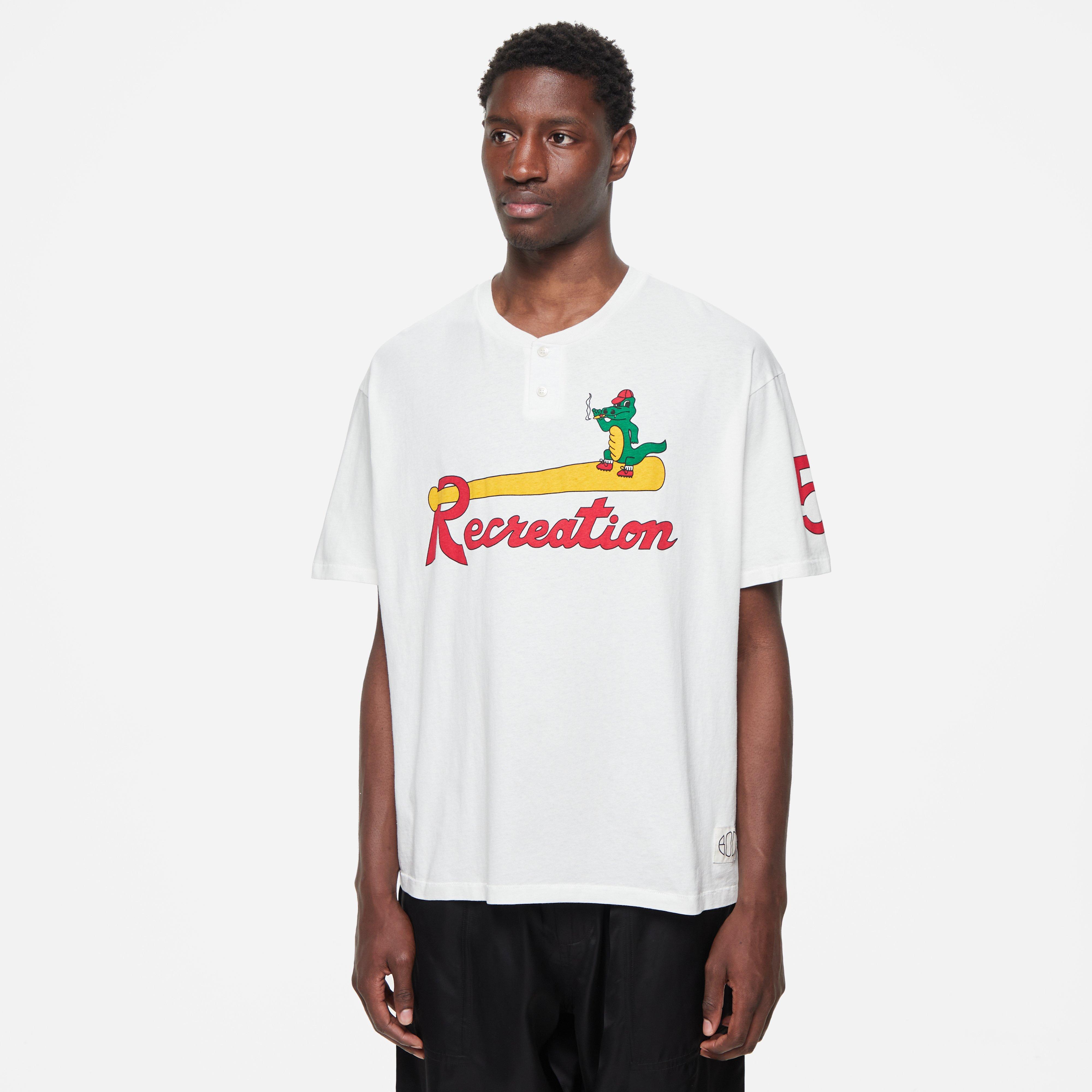 They point to stories from past eras and styles, and a larger vision to preserve forgotten craft. The Reptile Rec T-Shirt is inspired by a vintage 1980s shirt. White - 100% cotton - Made in Portugal - Graphic prints - Applique Bode tag - Model is 6'1" and wears size medium.