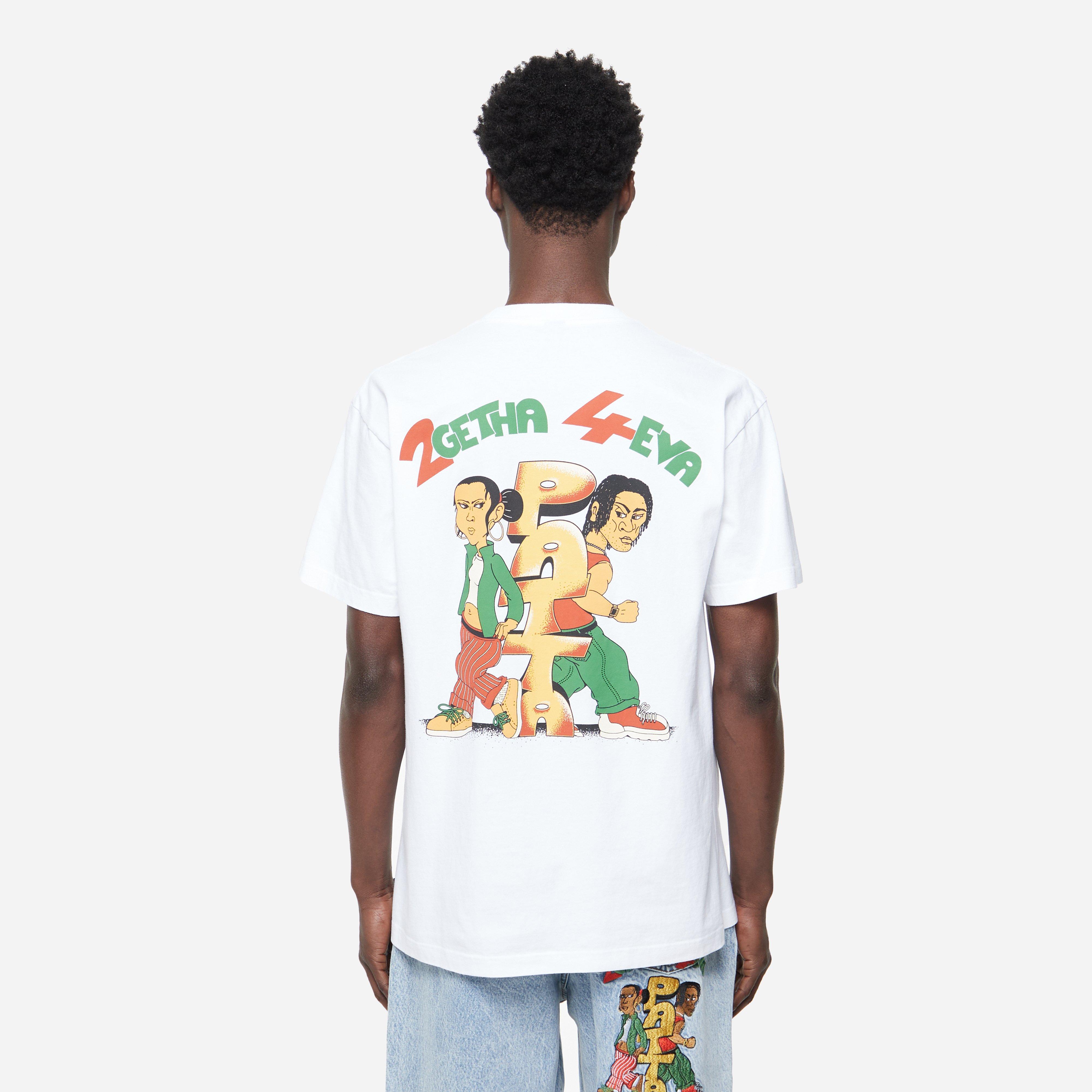 White - 100% cotton - 230gsm - Rib collar - Patta woven label - Silkscreen printed graphics - Made in Portugal - Model is 6'2" and wears size medium.