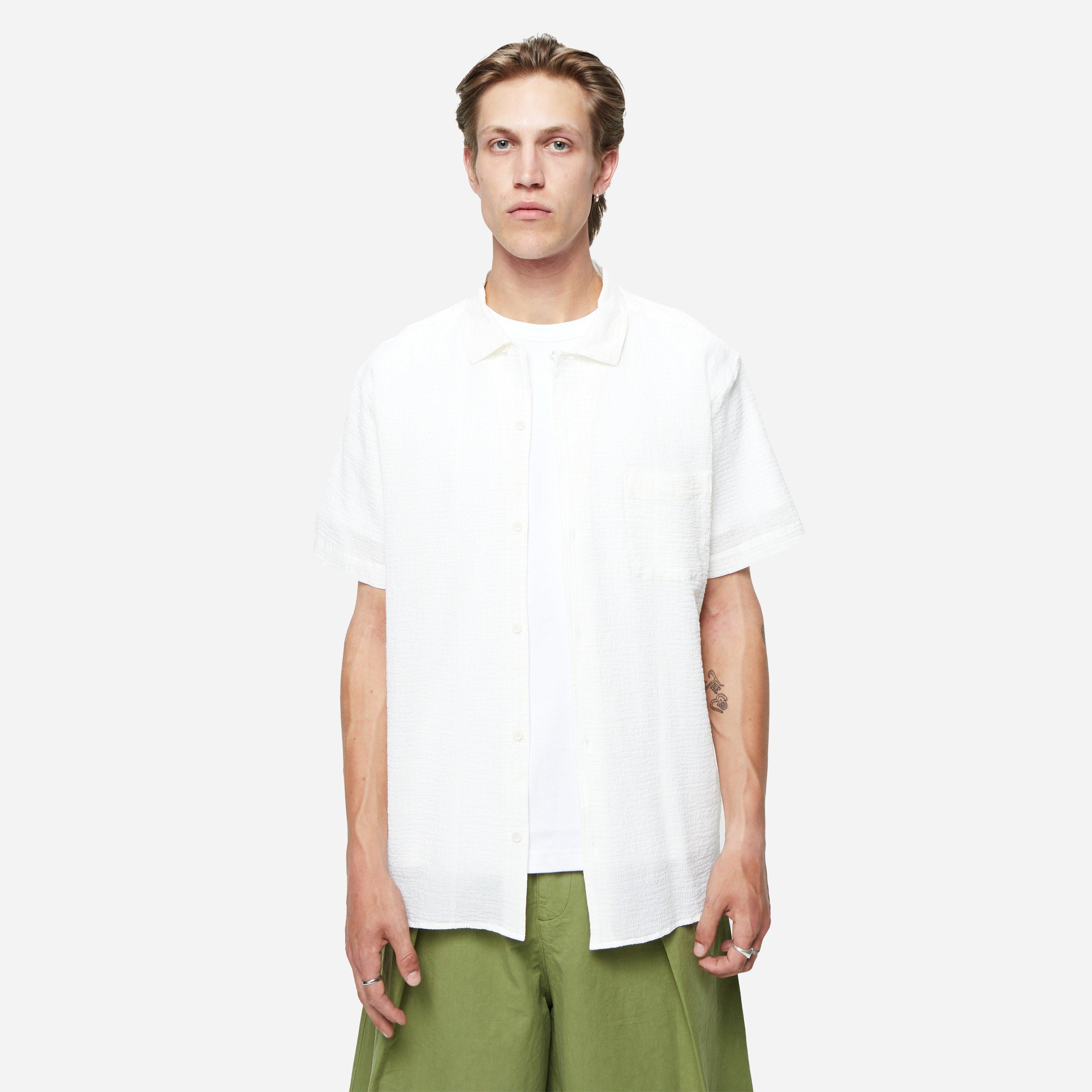 White – 98% cotton, 2% elastane – Relaxed fit – Cuban style collar – Garment washed – Seersucker check fabric – Chest patch pocket – Corozo button closures – Model is 6’2.5’’ and wears a size medium.