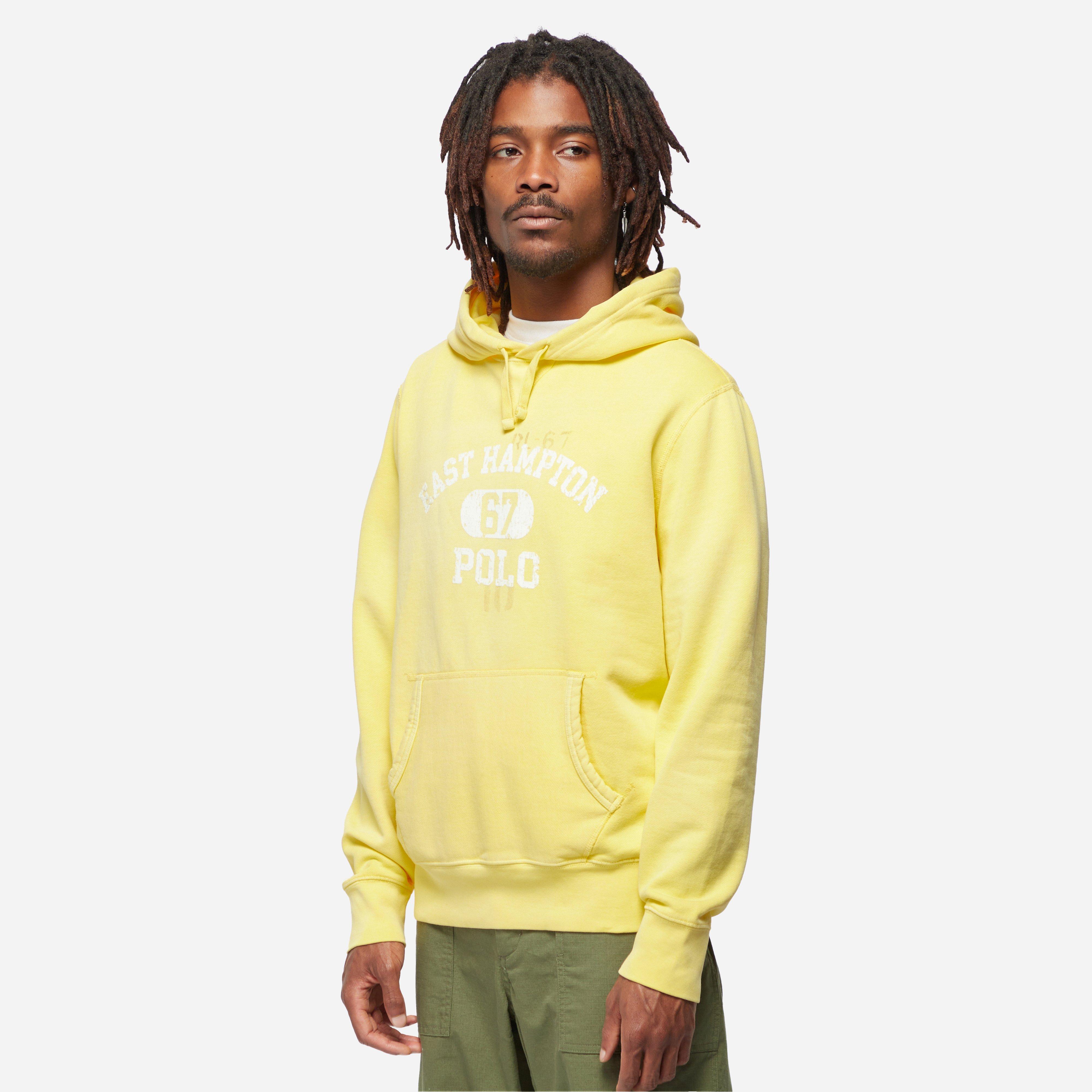 The retro theme continues with original Polo Ralph Lauren branding, specially treated to evoke a timeworn look. Yellow - 100% cotton/ polyester blend - V inset - Drawstring hood - Ribbed trims - Printed artwork - Vintage wash - Regular fit, take your normal size - Model is 6'0" and wears a medium.